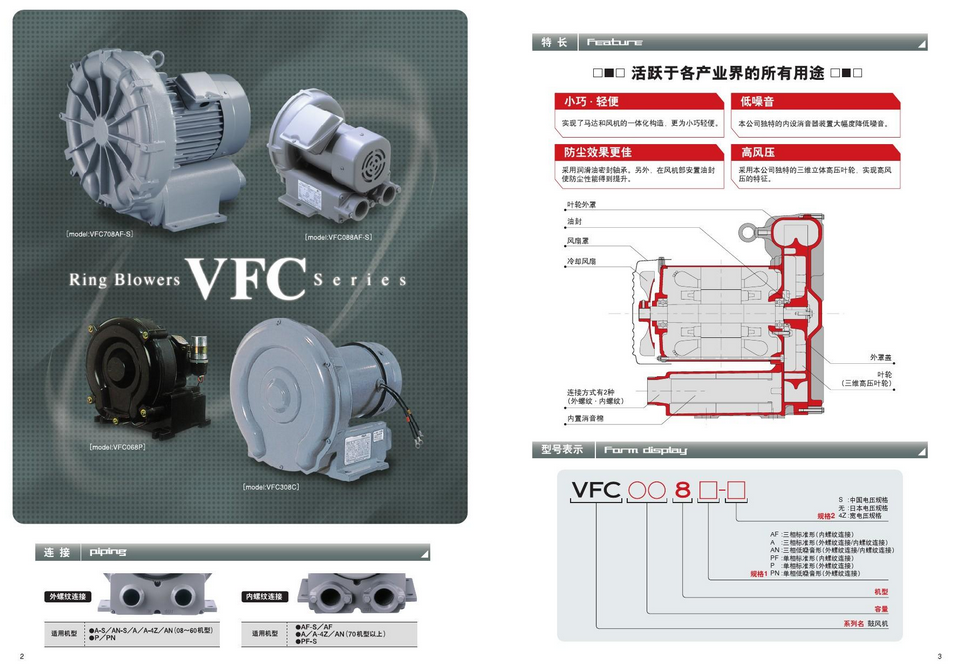 第天。 vfc208an富士環(huán)形鼓風(fēng)機(jī)的特點(diǎn):; 鋁壓鑄葉輪:產(chǎn)生穩(wěn)定的氣流和高效的氣流;動(dòng)平衡葉輪:運(yùn)轉(zhuǎn)更平穩(wěn),運(yùn)轉(zhuǎn)時(shí)不會(huì)產(chǎn)生振動(dòng)。雙蓋軸承:防止油脂泄漏,提高運(yùn)行可靠性。防塵軸封:防止灰塵侵入,延長(zhǎng)軸承壽命;電機(jī)主軸和葉輪的馬賽克組合:無需接頭、皮帶或齒輪,因此無需擔(dān)心斷裂和磨損;50/60hz和寬應(yīng)用電壓設(shè)計(jì):減少制造商的庫存需求。高效冷卻風(fēng)扇:可有效冷卻電機(jī)和氣泵,使其高效、低噪音運(yùn)行;嵌入式熱保護(hù)器(可選):可更有效地防止電機(jī)過熱,增強(qiáng)產(chǎn)品的可信度。小型化設(shè)計(jì):允許用戶更有效地使用和安裝空間;可拆卸管件(可選):更易于安裝富士鼓風(fēng)機(jī)產(chǎn)品型號(hào)。